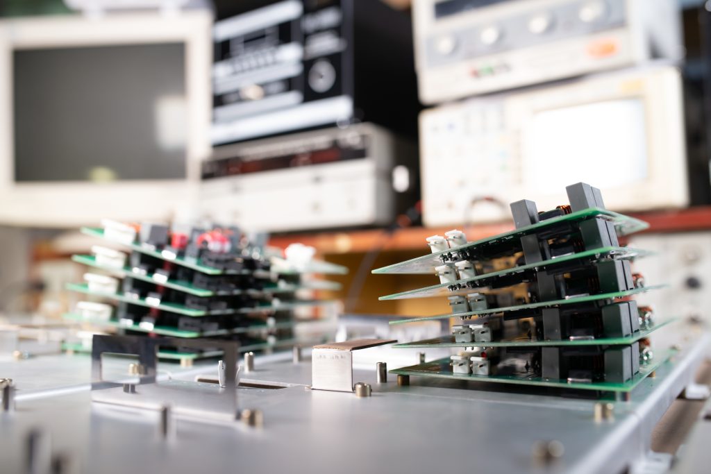 Microchips are stacked on top of each other on metal plates in the manufacture of super modern powerful computer equipment for a modern cardiology clinic. Powerful specialized computers concept