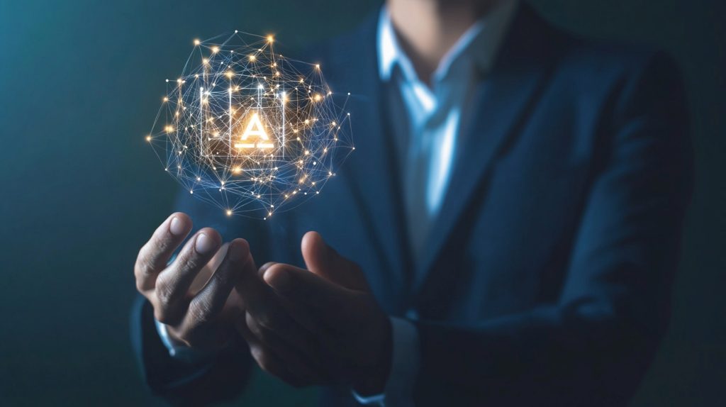 Businessman Holding a Virtual AI Sign with Digital Network Connection, Representing Integration of Artificial Intelligence and Technology